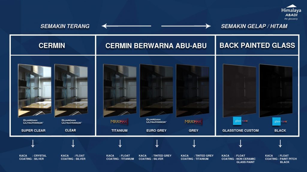 Pada artikel yang lalu, kita sudah membahas mengenai jenis-jenis dari cemin bronze. Selain cermin bronze, cermin warna yang populer dikalangan interior design dan arsitektur di Indonesia adalah cermin dengan turunan warna abu-abu atau “grey”. Karena warnanya yang cenderung memberikan efek pantulan yang sedikit gelap, maka dari itu cermin grey merupakan padanan material kaca yang tepat digunakan untuk area-area yang menghendaki suasana dan nuansa yang santai. Berikut ini adalah alternatif-alternatifnya: