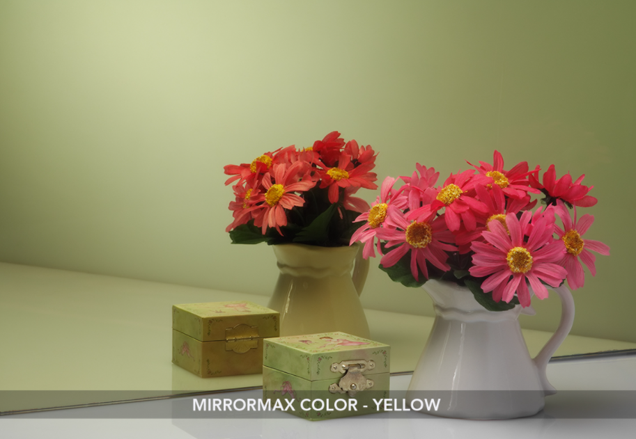 Salah satu keunggulan kaca cermin yang diproses dengan teknik titanium bisa menghasilkan kaca cermin anti bercak hitam dan juga tersedia dibeberapa opsi warna. Buat teman-teman yang menghendaki efek warna emas, kami berikan informasi 2 alternative dari series Kaca Mirromax Color yakni Mirromax Color Gold dan Mirromax Color Yellow. Kedua jenis warna ini menghasilkan warna emas yang mewah dan glossy, kalian tinggal pilih jenis warna emas mana yang cocok buat penggunaan interior kalian masing-masing. Beberapa customer kami memilih warna yellow yang menghasilkan efek gold juga terutama untuk area interior yang lebih terang.
