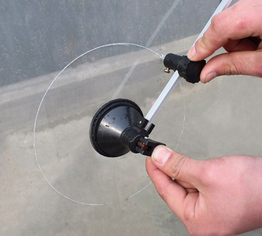 Kami lampirkan contoh circle cutter yang bisa dipakai untuk memotong kaca cermin lingkaran. Karena pada umumnya kami menggunakan circle cutter atau alat potong kaca bulat, maka dari itu keterbatasan daripada alat ini akan membuat maksimum diameter pada kaca cermin berkisar di 1.5 meter saja. Jikalau lebih dari itu kita perlu mempersiapkan alat lain yang lebih kompleks, dan tidak selalu tersedia untuk pekerjaan diluar Jabodetabek.