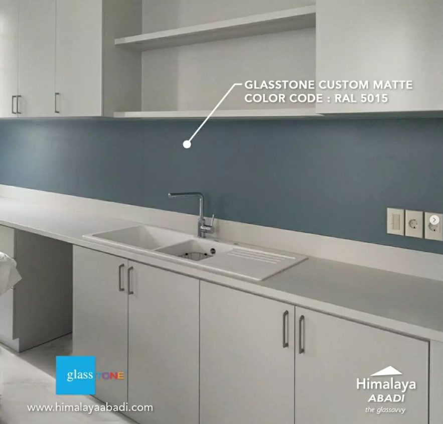 Kaca glasstone adalah kaca backpainted glass atau painted glass dari Himalaya Abadi yang dimana kaca tersebut dibuat dengan melapis permukaan kaca dengan glass paint. Maka dari itu kaca ini sangat cocok untuk diaplikasikan sebagai kaca kitchen set karena efek gloss yang didapatkan akan menambah kemewahan dari kitchen set tersebut. Pada umumnya, kaca backpainted glass ini dipasangkan sebagai panel, kaca backsplash, atau sebagai kaca top table di kitchen set. Sekarang kaca glasstone pun sudah bisa di custom warnanya mengikuti tema dari sebuah ruangan tersebut.