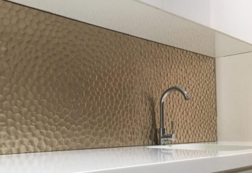 Jenis kaca yang terakhir adalah kaca film dekoratif yang dikombinasikan dengan kaca polos (float glass) atau kaca bertekstur (patterned glass). Dengan demikian para arsitek dan designer bisa mengkombinasikan texture, warna, motif sebagai alternative untuk menghiasi area dapur. Maka dari itu dengan menggunakan kaca film tersebut (wall film dan finura), maka backsplash, top table, dan panel lemari pada kitchen set pun akan terlihat lebih mewah dan unik.