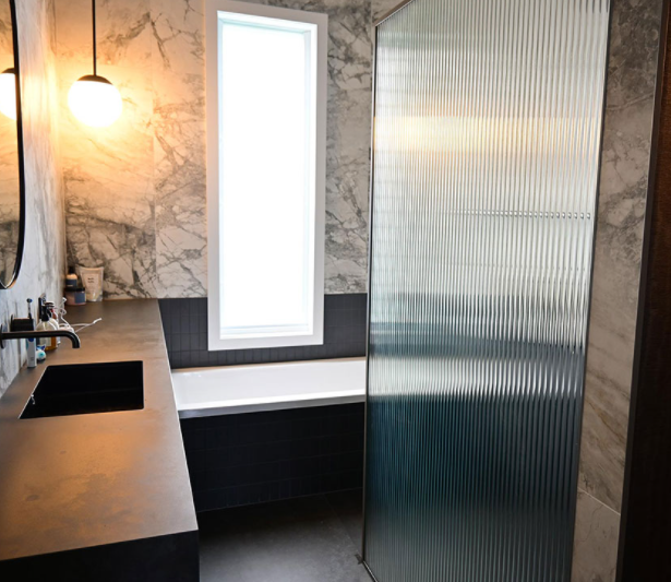 Perlu kami ingatkan juga alternatif berikutnya yaitu kaca fluted glass atau kaca ribbed glass yang biasa kita kenal dengan kaca moru dari series kaca dania patterned glass. Meskipun level privacy daripada kaca ini lebih rendah dibandingkan dengan kaca acid, tapi perlu dipertimbangkan untuk masuk kedalam estetika desain untuk kamar mandi. Jikalau jenis kaca ini mau dipakai sebagai pembatas seperti kaca acid, permukaan kaca ini bisa diproses juga dengan proses acid etching untuk menambah efek privacy diantara kaca shower box dan juga untuk area bathtub juga.