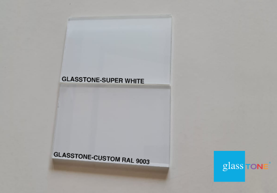 Kaca putih susu adalah termasuk kategori kaca back painted glass, atau sering disebut oleh rekan-rekan dibidang interior sebagai kaca glasstone. Warna yang super putih ini dihasilkan oleh 2 komponen, yakni bahan baku kaca extra clear, dan juga coating solid color berwarna putih yang sangat terang. Dengan kombinasi kedua bahan baku ini akan menghasilkan warna putih yang maksimal. Kami lampirkan diatas perbedaan warna dari substrate kaca extra clear untuk membuat kaca glasstone dengan coating warna GW-26 (super white) dibandingkan dengan warna RAL 9003 (pure white). Sehingga untuk menghasilkan kaca warna putih susu, umumnya menggunakan chemicals GW-26 dan juga RAL yang berkisar di kode warna 9000-an.