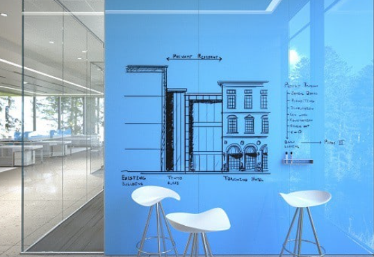Selain dari ukuran yang besar, keunggulan menggunakan material tersebut sebagai glassboard kaca papan tulis adalah dari segi warnanya. Kaca glasstone atau kaca back painted glass bisa dicustom warnanya sesuai dengan kebutuhan dan tema desain yang diusung oleh desainer ruangan. Maka dari itu, kita bisa memilih segala macam warna yang sesuai dengan keinginan kalian masing-masing. Kami melampirkan salah satu contoh dengan warna biru yang sengaja dipilih untuk aksen pada ruangan.