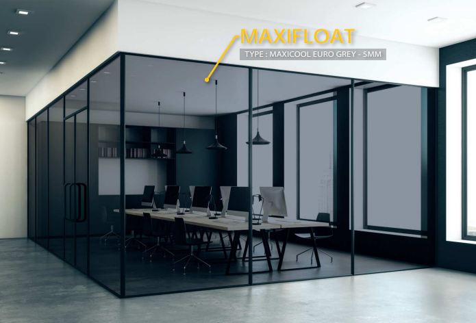 Kaca ini sering disebut dengan nama kaca riben atau kaca tinted glass, kami sering menyebutnya dengan istilah kaca maxifloat. Kalian bisa menerapkan jenis kaca ini sebagai sekat kaca ruangan atau partisi kaca ruangan yang menghendaki desain frameless. Karena warna ini akan menghidupkan secara estetika untuk ruangan yang ada. Pastikan penggunaan warna tersebut relevan dengan desain kalian masing-masing.