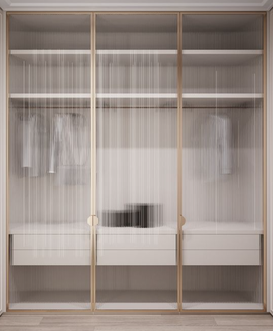 Tidak sedikit juga penggunaan jenis kaca motif garis yang sering dikenal juga dengan kaca tekstur garis dari series Dania Patterned Glass. Buat kalian yang lebih nyaman untuk menyembunyikan tas tersebut dan masih ingin ada bayangan samar-samar, kalian bisa menggunakan jenis kaca tersebut untuk menunjang kebutuhan lemari kaca anda.