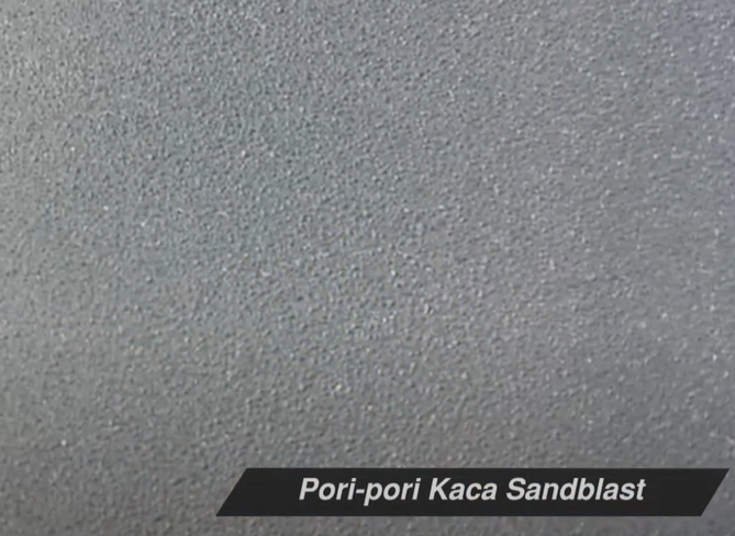 Berikut ini kami juga memberikan contoh yang tidak kami rekomendasikan dalam memilih kaca buram atau frosted glass untuk area pintu. Meskipun istilah kaca sandblast atau sticker sandblast sering terdengar untuk menggunakan efek buram pada kaca, tapi kami tidak merekomendasikan karena pori-pori yang terlalu besar sehingga mudah menyimpan kotoran, serta jika efek buram didapatkan dengan sticker sandblast kaca, maka sticker tersebut akan terkelupas suatu hari. Sehingga kami selalu merekomendasikan kaca acid untuk efek buram pada kaca.