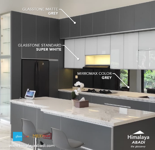 Untuk kalian yang ingin menggunakan warna untuk disesuaikan dengan tema warna design yang kalian inginkan. Pilihan jenis dari series Kaca Glasstone atau kaca berwarna solid juga sangat sering diggunakan pada kitchen set khususnya pada area pintu kabinet, terutama untuk warna putih dari series kaca Glasstone Super White. Penggunaan jenis Kaca Glasstone ini sangatlah ideal untuk kalian yang senang dengan warna solid untuk diaplikasikan di area tersebut. Kalian bisa memilih warna custom yang sesuai dengan keinginan kalian atau menggunakan warna standard yang sudah tersedia dari kami. Selain itu, pilihan dari series Kaca glasstone ini juga tersedia dalam pilihan permukaan yang bersifat glosy dan juga matte untuk kalian sesuaikan.