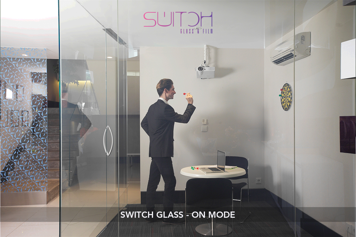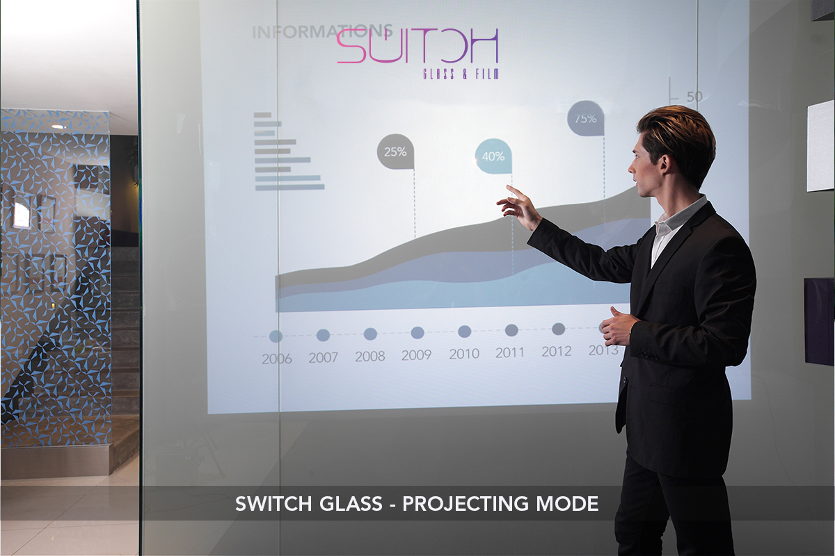 Switch Glass dapat juga berfungsi sebagi layar proyektor (Projector Glass), maupun sebagai layar interaktif (Interactive Glass).