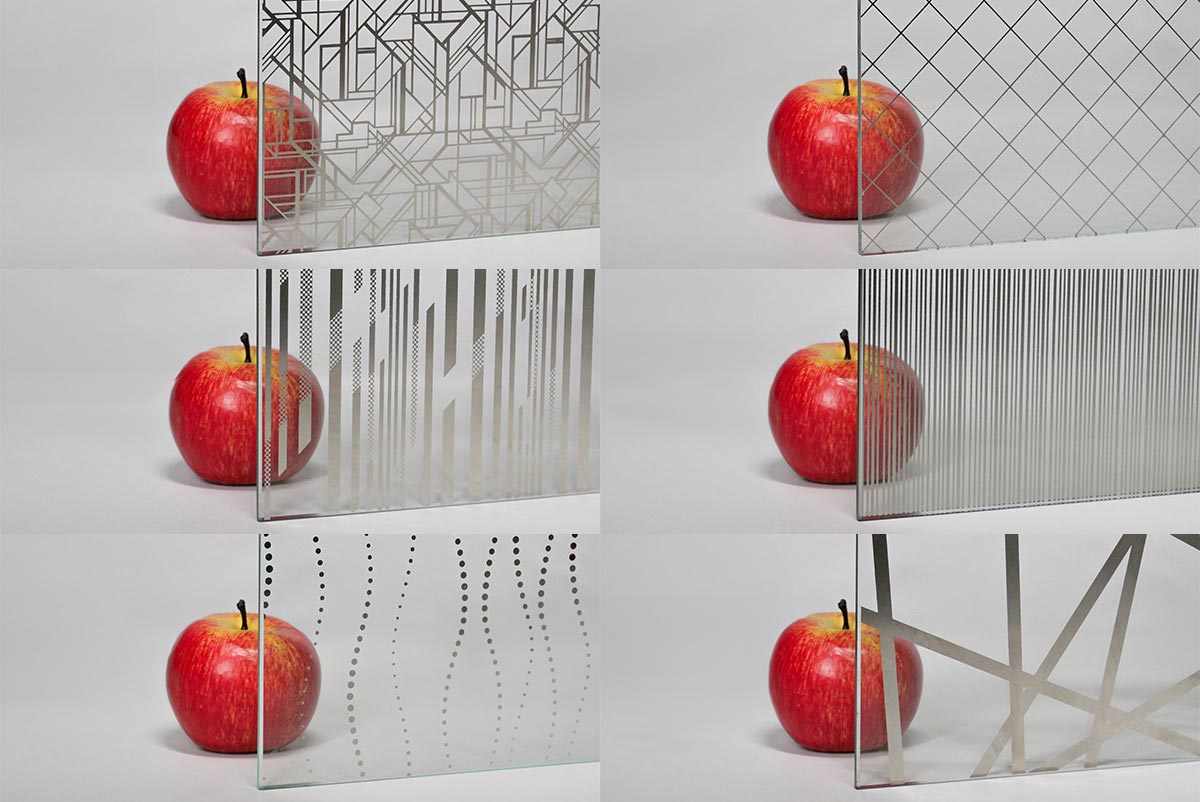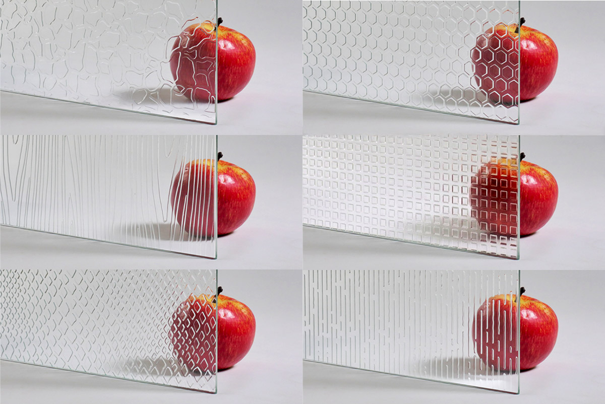 Kaca motif yang diproses dengan metode acid etching dan deep-stamping.