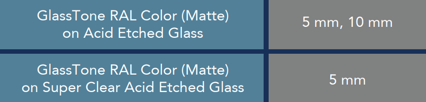 Berbeda dengan kaca glasstone glossy, kaca glasstone matte tersedia dengan pilihan 5mm dan 10mm saja. Hal ini dikarenakan teknik produksinya yang berbeda dan juga kita sudah survey kebutuhan secara umum kaca glasstone matte akan berkisar untuk tebal 5mm dan 10mm.
